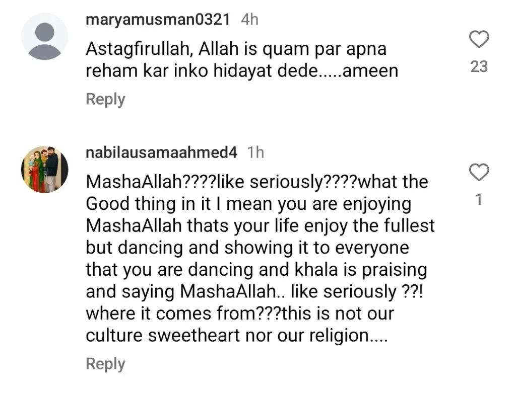 Bushra Ansari, known for her close bond with Zara, praised her niece in the comments by writing, “That’s like my good girl.” Please don’t stop now! Once a week I need this craft from you. Bushra intended her comment as a gesture of encouragement, but it sparked significant controversy online. Many social media users have criticized Bushra for praising Zara’s dance, citing concerns over Islamic values. Some users argued that such praise, especially using Islamic expressions like Mashallah, doesn’t align with religious teachings.