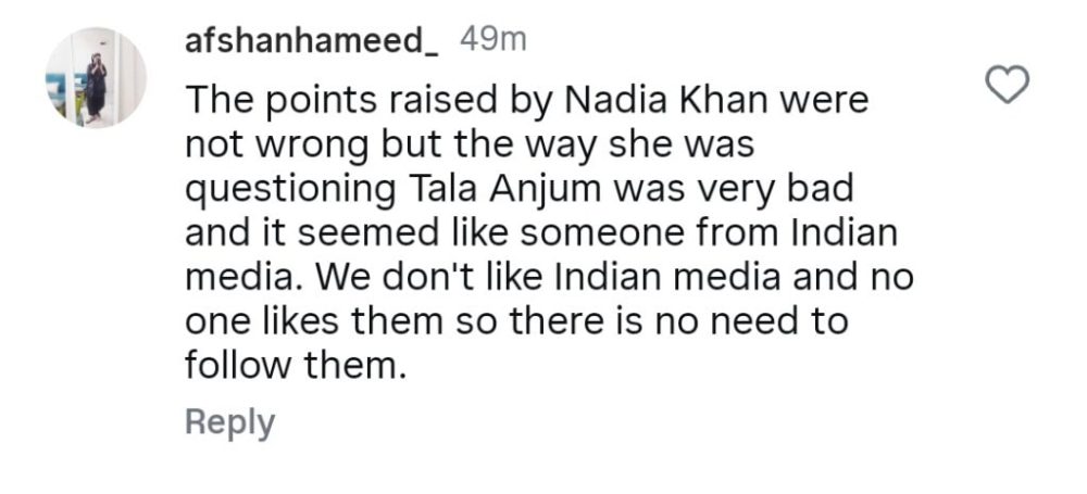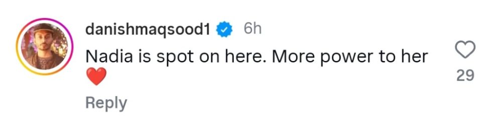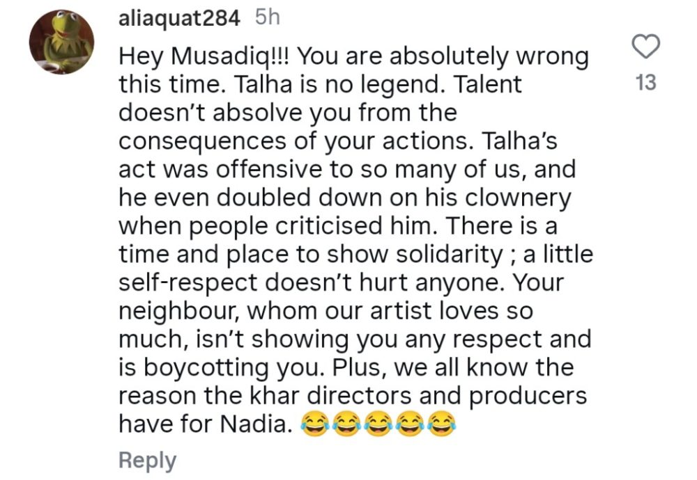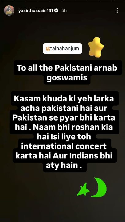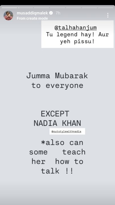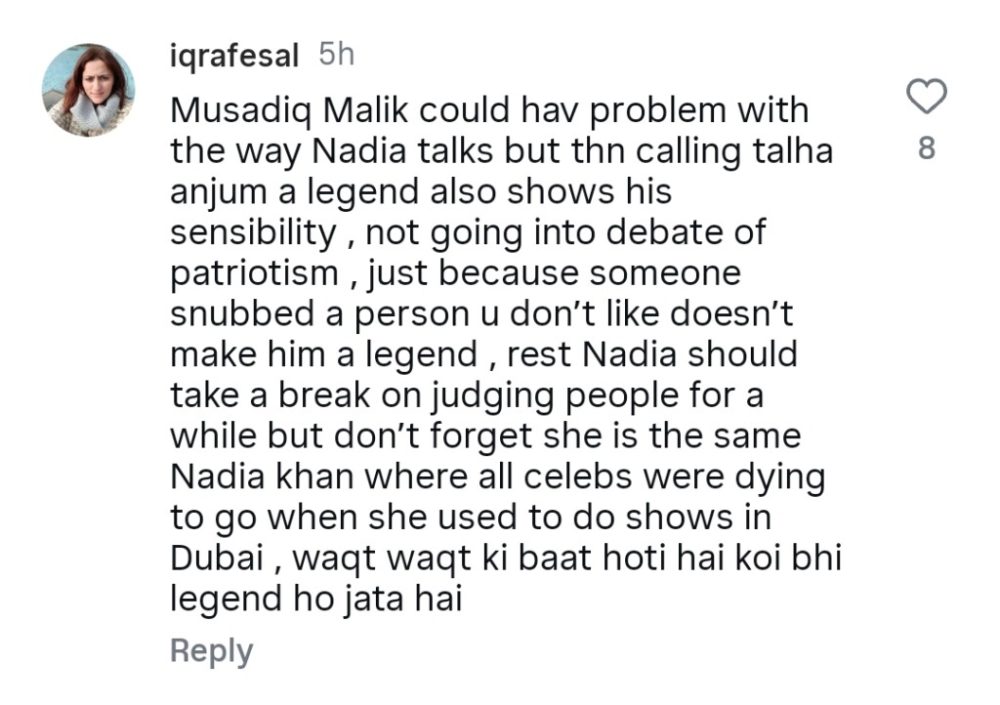 Yasir Hussain compared Nadia Khan to Indian journalist Arnab Goswami and praised Talha as a patriotic Pakistani artist who has earned international acclaim. Musadek Malek, in a humorous yet critical post, called Talha a legend while referring to Nadia as “Pissu.”