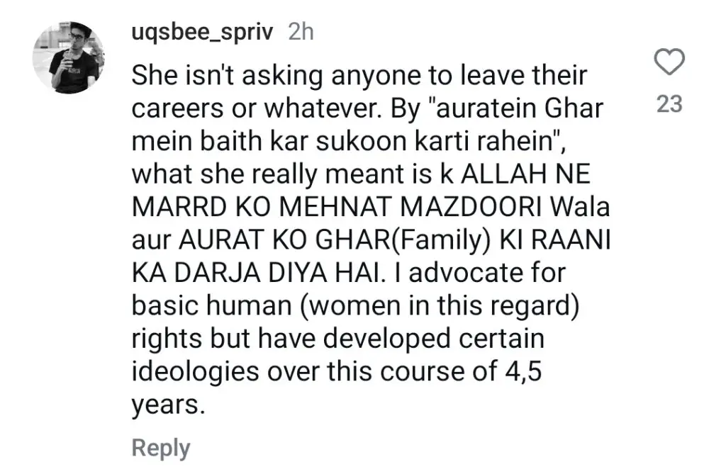 On one hand, several netizens praised her stance. One user wrote, “She’s spreading the right values,” while another commented, “Traditional roles keep balance in society.” A third echoed, “Islam already grants women rights — we don’t need Western feminism.”